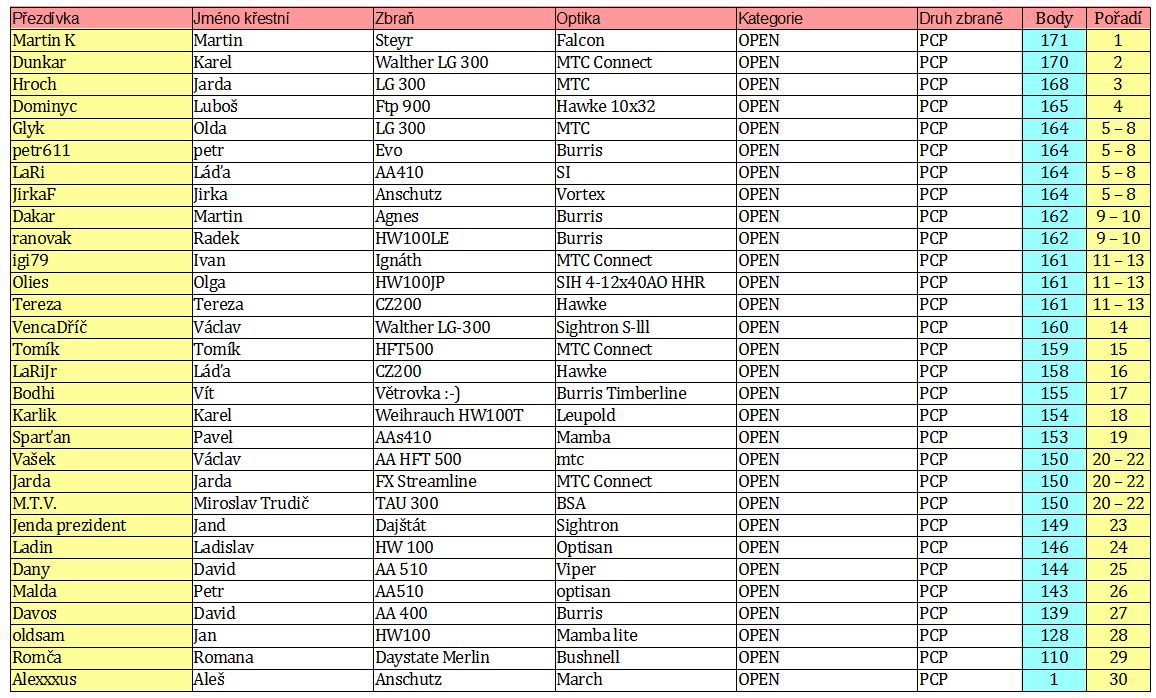 3 junioři něco pružinovkářů a ti zbylí to byli samozřejmě střelci z větrovek.