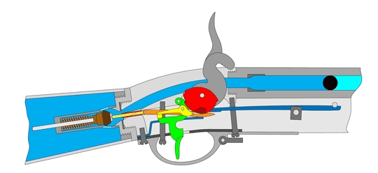 následně za pomocí listové pružiny vrátí blok se střelou před ústí hlavně - následně stačí natáhnout bicí kohout a puška je připravena ke střelbě.